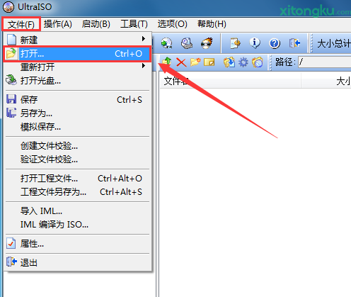 2、打开UltraISO(软碟通),在菜单中 “ 打开 ” 并选取等待安装的 ISO镜像文件